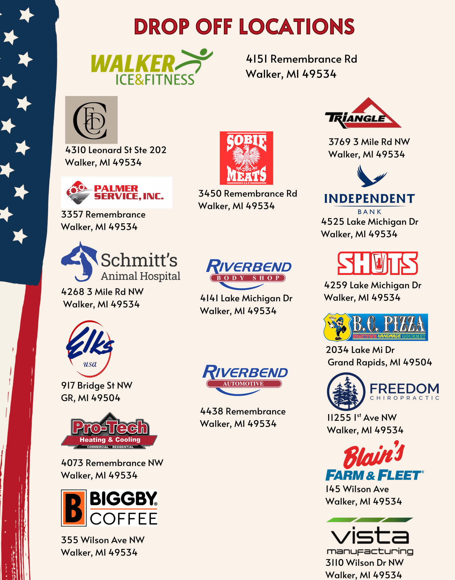 Starting October 1, 2025, the City of Walker Parks and Recreation Department will be collecting items to donate to the West Michigan Veterans Assistance Program. WMVAP assists homeless and near-homeless Veterans and their families who have needs that are not being met. In the past, we have been able to donate an entire truckful of items thanks to the generous help from our Walker community. Help us honor our veterans and their families by donating.